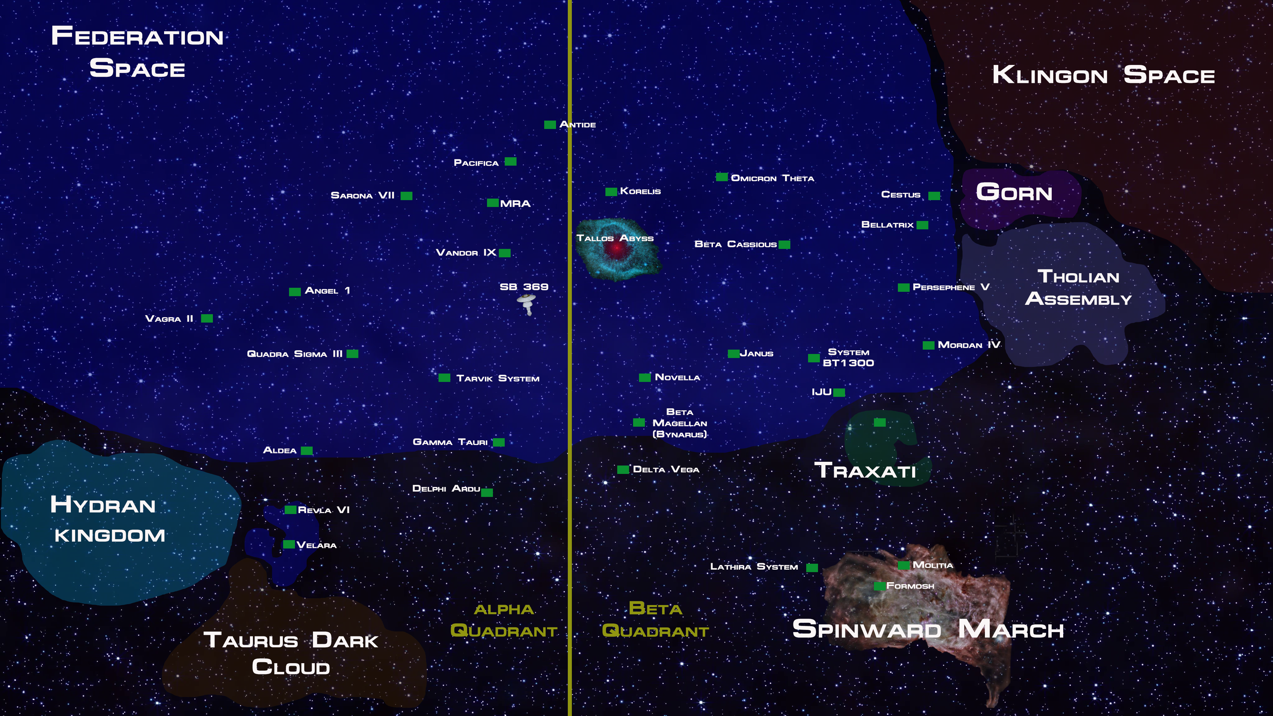 This map represents the area of Command for Epsilon Fleet. This is the 'southern' part of the Alpha/Beta quadrants when looking from the top down of a 2d map.